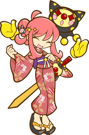 A swordswoman who, as a consequence of wielding the Blade of Mirth, suffers the 'Curse of Perpetual Ever-Impending Laughter'.Leader skill: Accursed Knight of the Moon